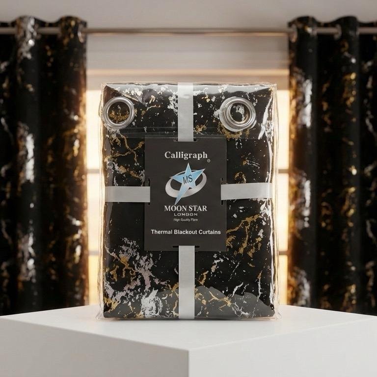 Add a touch of modern luxury to your home with these Calligraph Moon Star London blackout curtains. Featuring a dramatic black background with a striking gold and silver metallic marble print, these curtains are designed to be a statement piece in any bedroom or living room.